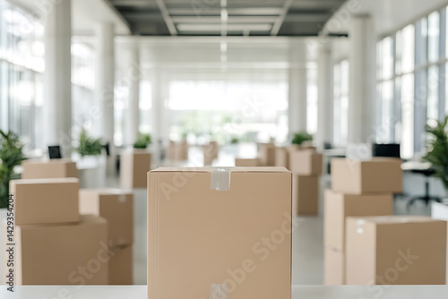 office, relocation, moving, delivery, cardboard box, stack, table, modern, bright, interior, plant, workplace, business, organisation, storage, shipment, distribution, logistic, space, arrangement, paperboard, container, cargo, merchandise, good, item, supply, equipment, packing, unpack, transition, company, corporate, furniture, desk, window, daylight, indoor, large, white, simple, square, ship