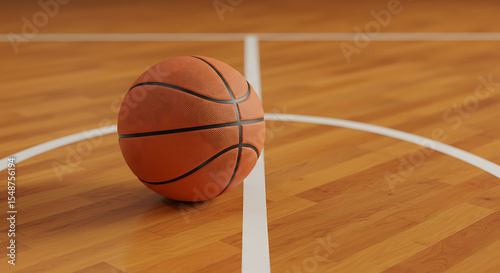 Official orange basketball resting on polished hardwood court surface, indoor sports arena background, close-up of professional game ball on gym floor