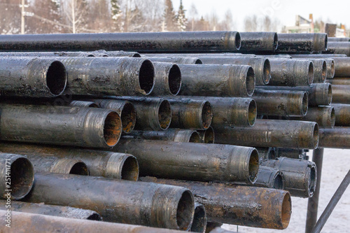 Offshore Industry oil and gas production petroleum pipeline. Downhole drilling rig. Laying the pipe on the deck. View of the shell of drill pipes laid in courtyard of the oil and gas warehouse.