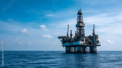 Offshore Oil Rig Standing in Vast Ocean Under a Clear Blue Sky with Scattered Clouds