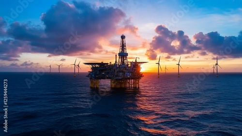Offshore oil rig sunset, wind turbines, energy transition