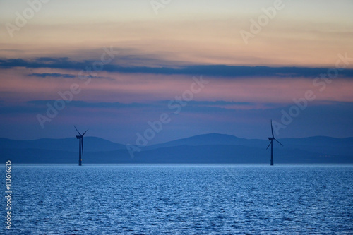 wind, turbine, windmill, offshore, off, shore, energy, generation, power, electricity, eco, sunset, dawn, dusk, sea, ocean, hill, mountain, coast