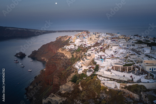 Oia town on Thira. Santorini island with colorful volcanic cliffs and deep blue sea aerial view