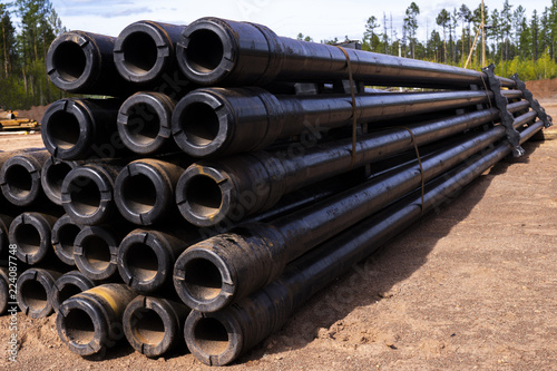 Oil Drill pipe. Rusty drill pipes were drilled in the well section. Downhole drilling rig. Laying the pipe on the deck. View of the shell of drill pipes laid in courtyard of the oil and gas warehouse.