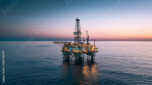 oil, drilling, platform, ocean, rig, wave, water, sunset, sky, contrast, dramatic, dark, expanse, blue, gold, tower, industry, maritime, offshore, energy, extraction, marin, engineering, structure, environment, nature, sea, horizon, huge, technology, resource, exploration, operation, heavy, machinery, solitude, serene, peaceful, dawn, transition, pink, calm, clear