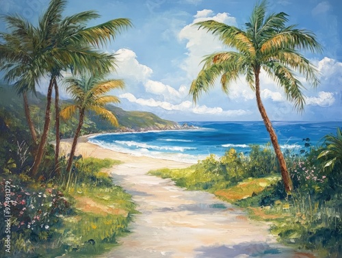 Oil painting showcasing a stunning outdoor landscape featuring a tropical beach with sea and ocean views