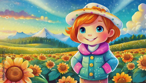 oil painting style cartoon character a close-up image of a baby Sunflower field over cloudy blue sky background,