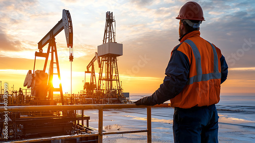 Oil worker observing sunset at drilling site offshore industrial environment inspiring viewpoint energy concept