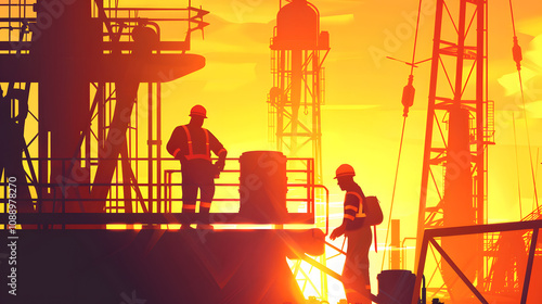 oil, extraction, crude oil, industry, sunset, isolated, white, background, pop art, men at work, labor, employment, rig, drill, platform, pump, refinery, pipeline, fuel, energy, resource, natural, environment, machinery, technology, equipment, safety, hazard, production, process, manpower, maintenance, hard hat, overall, uniform, teamwork