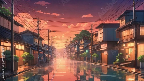 old 90s style anime background rainy town