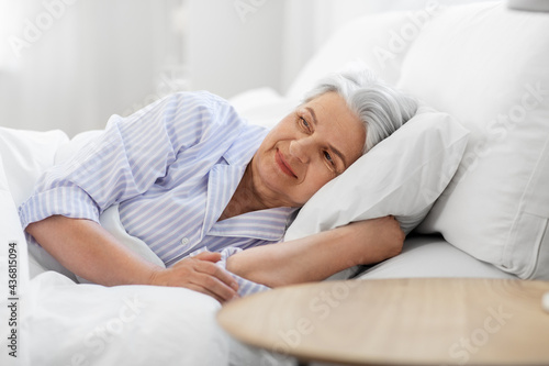 old age and people concept - happy smiling senior woman lying in bed at home bedroom