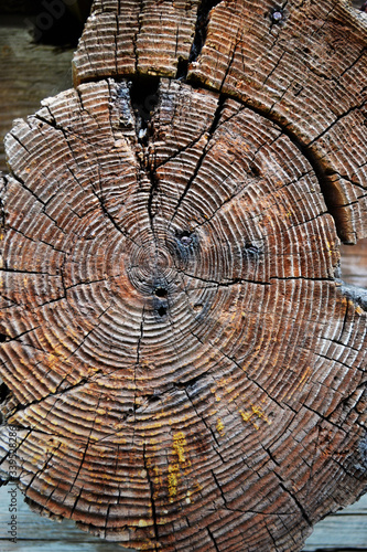 Old brown tree with annual rings and yellow resin drops