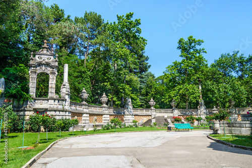 Old decorative wall in Massandra park with stone bowls, columns etc. This is part of Massandra palace complex, which was founded in 1881. Now it's popular tourist place. Shot near Yalta, Crimea