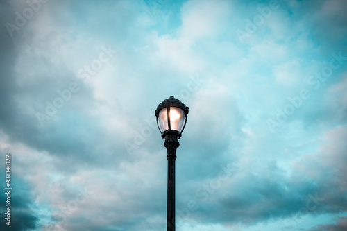 lamp, light, sky, street, blue, lantern, post, lamp-post, cloud, cloud, street light, lighting, old, city, architecture, bulb, illumination, pole, glasses, white, metal, urban, street light, object, antique