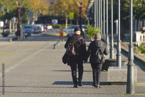 old, man, woman, walking, sidewalk, wearing, black, person, coat, hat, holding, human relationships, hand, lifestyle, street, adult, city, urban, outdoors, female, road, couple, autumn, beautiful, park, caucasian, together, 2, back, town, leisure, love, europa, background, travel, tour tourism, nature, business, pedestrian, motion, casual attire, day, male, vacation, aged, outside, holiday maker, life, modern