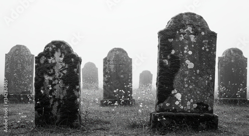 Old moss covered gravestones in a foggy graveyard A misty and mysterious scene of aged headstones in a cemetery