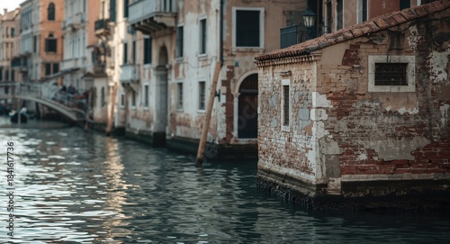 Old plaster buildings along a canal in Venice, maritime urban landscape, seasonal change