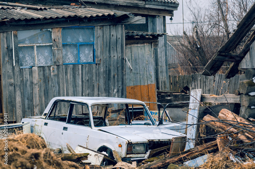 snow, snowflake, log, house, nature, auto, car, old, abandoned, spring, day, light, colours, tone, background, season, view, white, brown, atmosphere, landscape