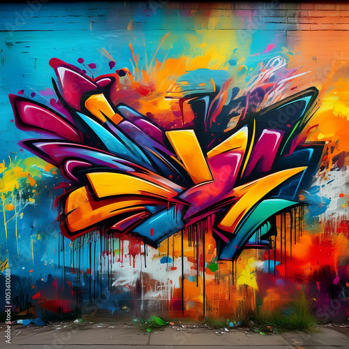 Old wall painted colorful graffiti drawing, aerosol paints. City graffiti backdrop, street art