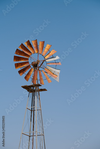 Old windmill standing tall against a clear blue sky in Namibia. Its weathered metal blades evoke a sense of timelessness and rural charm in the arid landscape.