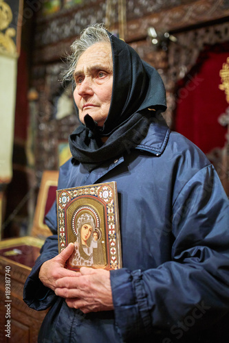 Old woman holding a religious icon