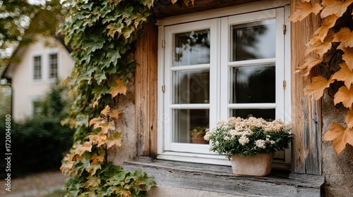 Old wooden window covered in ivy and brambles highlights urban decay, with cracked paint and broken glass adding character and charm