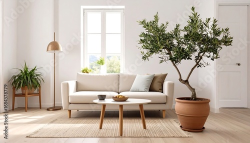 living room, interior, plant, home decor, furniture, couch, sofa, table, rug, window, natural light, minimalist, scandinavian, beige, brown, white, indoor plant, houseplant, decoration, style, design, comfort, relaxation, domestic, dwelling, apartment, residence, floor lamp, terracotta, wooden floor, clean, modern, contemporary, soft, calm, peaceful, airy, bright, simple, elegant, organic, botanical, green, still life, decorative, home, room