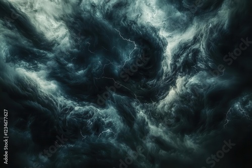 ominous dark storm clouds swirling dramatically, illuminated by lightning strikes, moody atmospheric weather photography with deep contrast