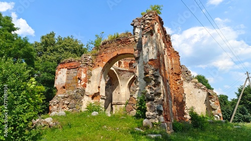 On a grassy hillock there are the remains of a church destroyed during the First World War, previously built of stone and red brick. There is a power line nearby. Sunny summer weather and blue sky