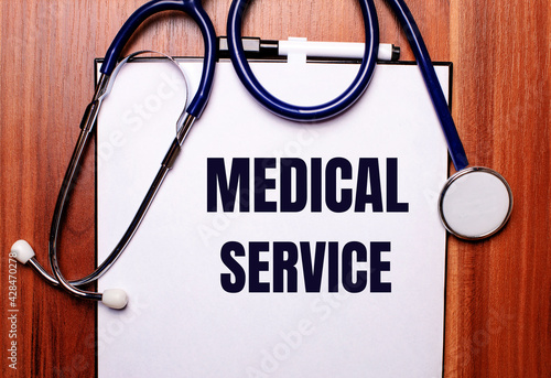 On a wooden background lies a stethoscope and a sheet of paper with the inscription MEDICAL SERVICE. Flat lay. Medical concept