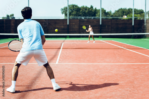 One more hit! Rear view of young couple playing tennis on the tennis court.