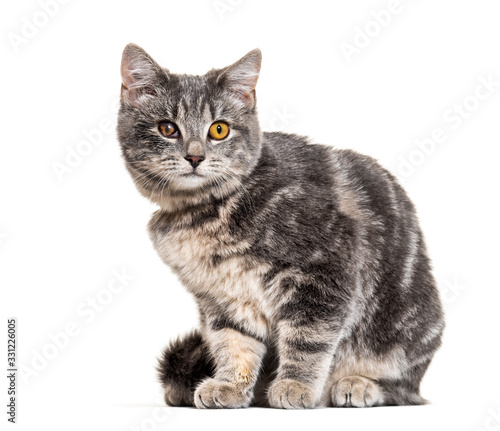 domestic cat, felino, carnivore, mammal, pet, domestic, vertebrate, animal, studio, studio shot, nobody, no people, crossbreed, disability, disabled, eye, blind, aged, old, white background, cut-out, isolated on white, isolated, white, sitting, one animal, grey, ageing, graying, cat