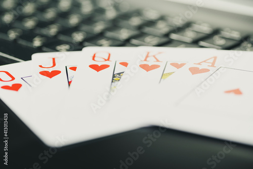 Online gaming platform, casino and gambling business. Cards, dice and multi-colored game pieces on laptop keyboard