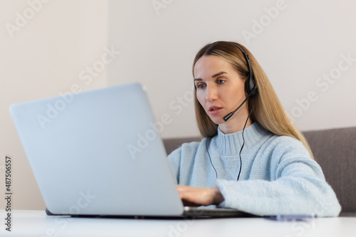 Online it support operator talking on video call. Customer care specialist wearing headset and speaking with customer. Sales manager woman calling client while wearing headphone with microphone