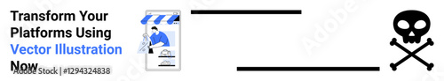 Online shopping storefront on smartphone beside danger skull icon signifying risks in e-commerce. Ideal for e-commerce safety, cyber risks, digital marketing, cybersecurity, financial awareness