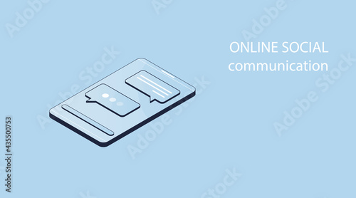 Online social communication. Isometric 3d vector illustration. Smartphone with speech bubbles