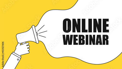 Online webinar label with megaphone for broadcasting live. Vector