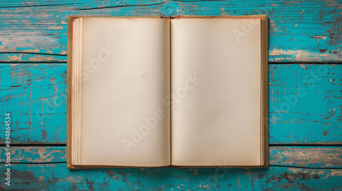 Open blank notebook isolated on blue background Blank book, top view, vintage style