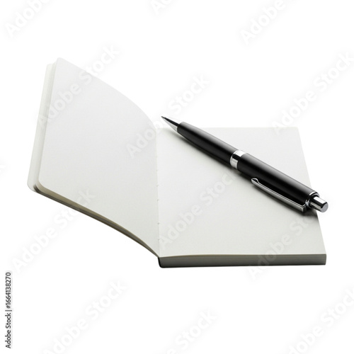Open blank notebook with a pen lying on it isolated on transparent background