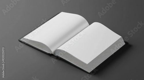 Open book with white pages and black cover on grey background