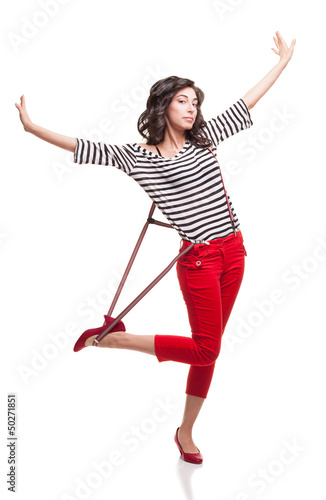 isolated, white, 20s, turkish, caucasian, woman, curly, brunette, high heel, pink, red, striped, capri, pant, hair, black, blue, looking, leg, lined, shoe, seasonal, summer, spring, bright, casual attire, trousers, high, heel, long, skinny, leggy, classic, slim, 1, model, young, gorgeous, pretty, beautiful, attractive, adult, female, cute, girl, standing, elastic, suspenders, braces