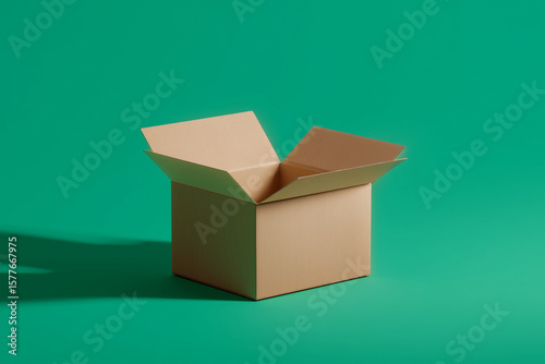 Open cardboard box with folded flaps on green surface casting soft shadow in minimal setting.