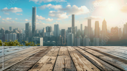 Open Empty Wooden Table With Skyscrapers City In The Background