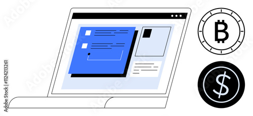 Open laptop displaying data charts and trade information beside Bitcoin and Dollar icons. Ideal for financial technology, cryptocurrency trading, digital investment, online banking, visual data