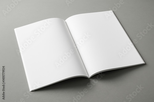Open Magazine on a Table: A pristine open magazine lays on a neutral gray surface, offering a clean slate for content, design, or branding, the epitome of simplicity and clarity.