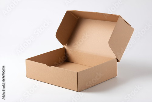 Open plain cardboard pizza box with hinged lid on a white surface. A blank packaging container representing delivery, branding, and takeaway service, isolated on white background.