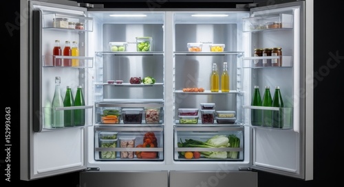refrigerator, open, fresh, vegetable, drink, condiment, modern, kitchen, refrigerator, food, shelf, organisation, beverage, bottle, jar, leafy, greener, healthy, nourishment, interior, storage, appliance, cooling, domestic, home, household, produce, colourful, neat, grocery, lifestyle, arrangement, culinary, cookery, diet, essential, sustainable, cardboard box, container, lighting, steel, door, preservation, crisp, daily, basic