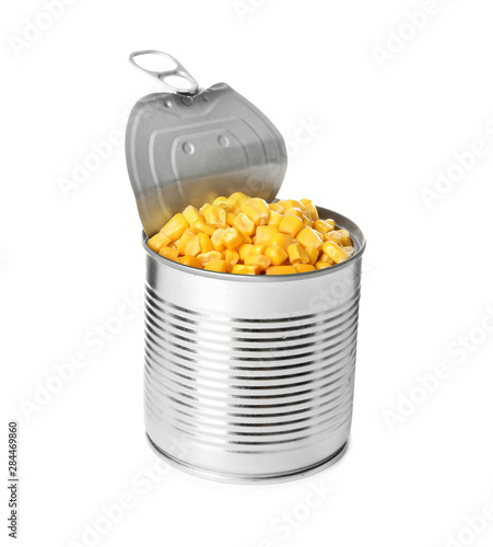 Open tin can of corn kernels isolated on white