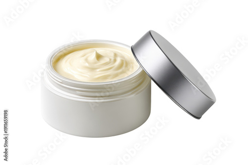 Open white jar with creamy yellow cosmetic product and silver lid container skincare, Png, Isolated on Transparent Background, Cut Out