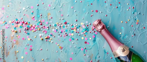 Opened champagne bottle with glitter and confetti. Festive background. top view